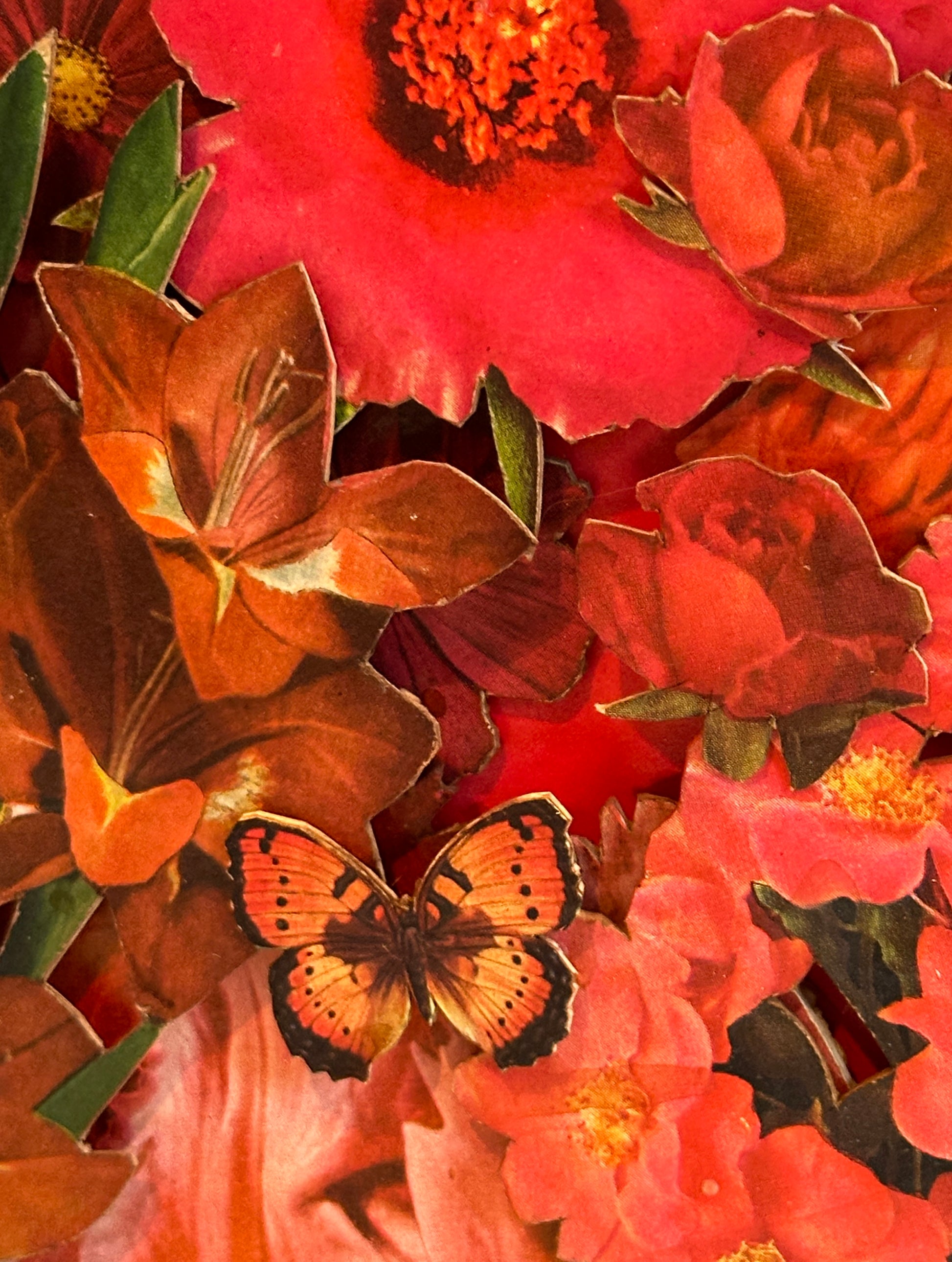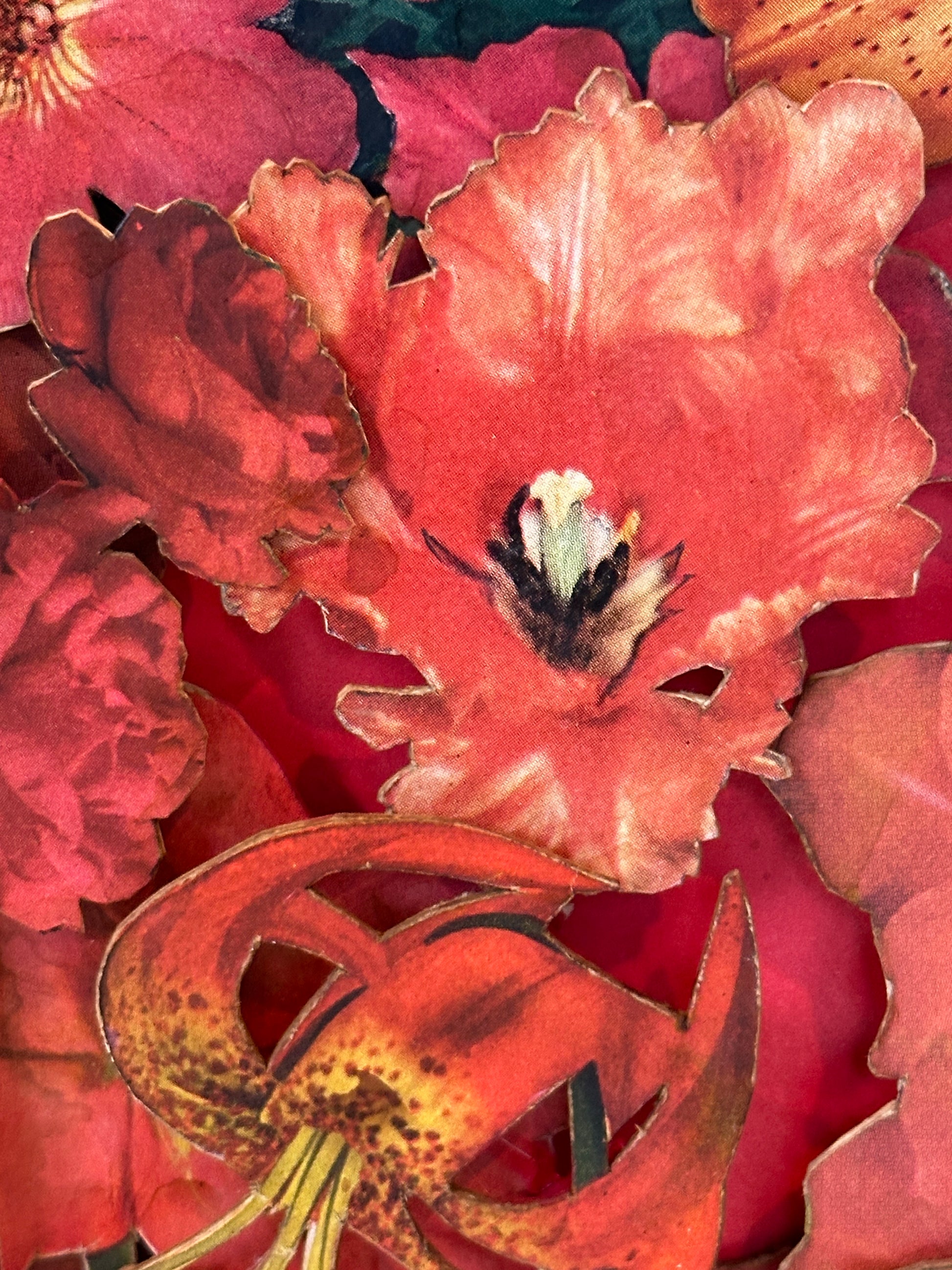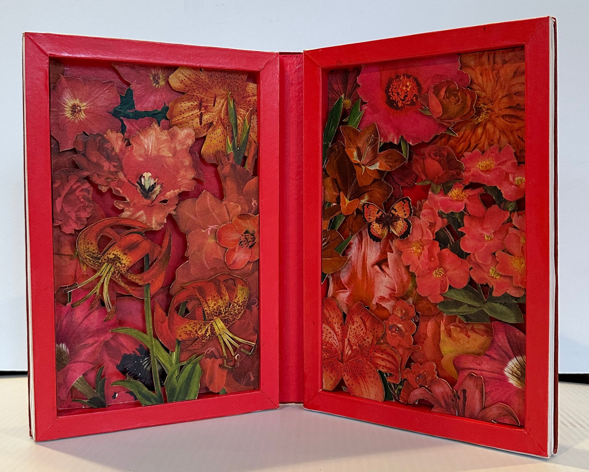 Details: 6"L x 9"H x 1.5"D. Vintage flower illustrations, vintage newspaper and marbled paper. Altered book.