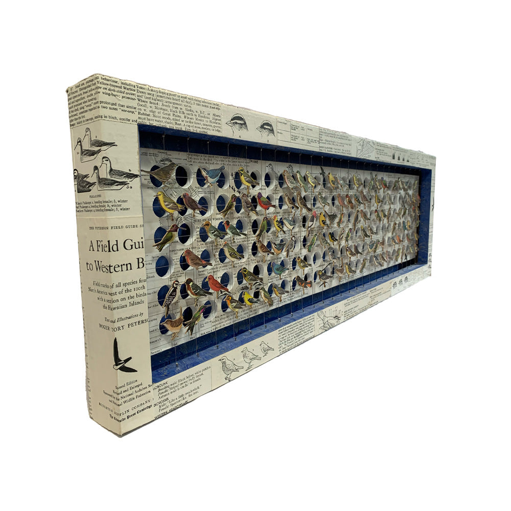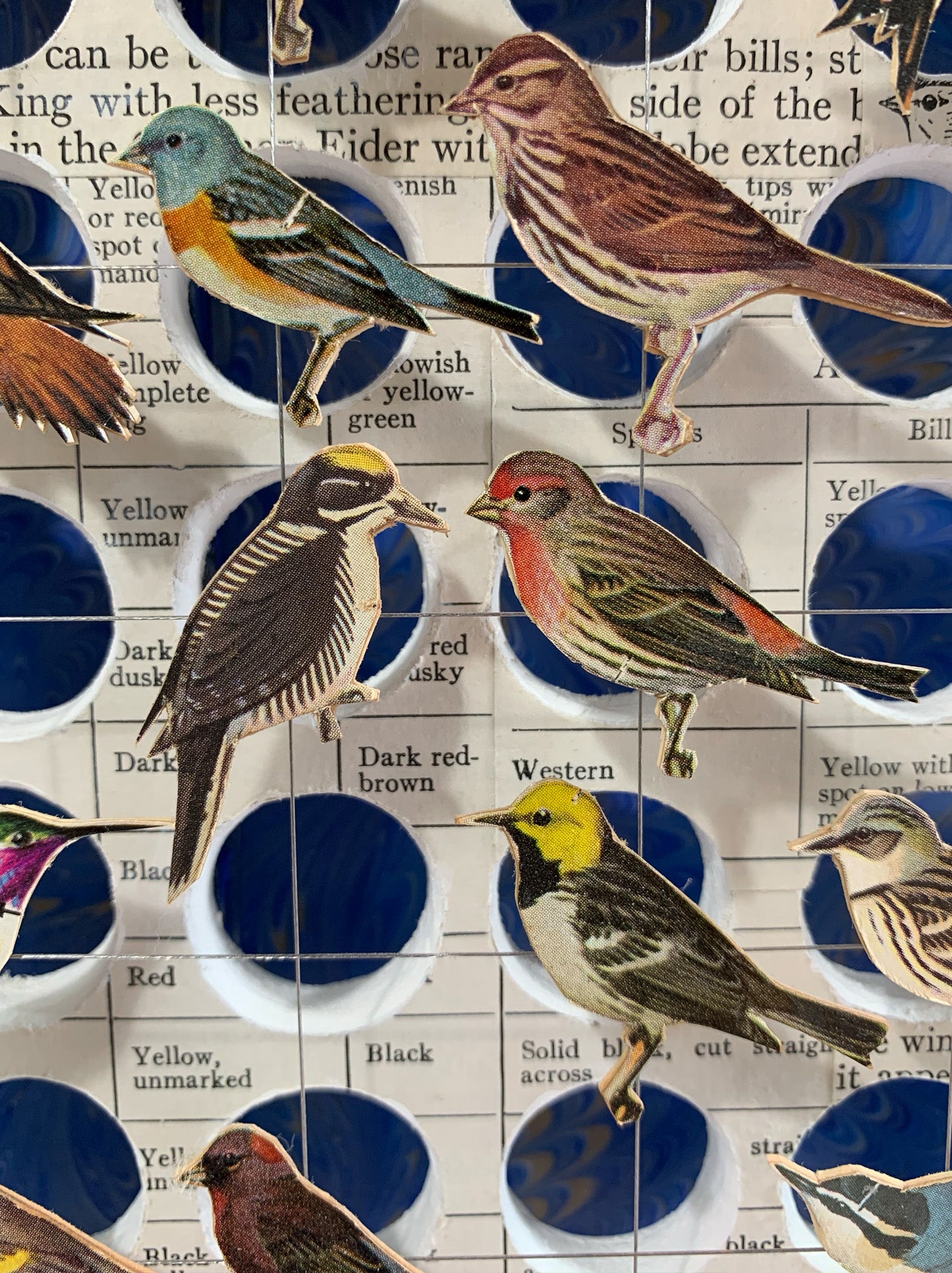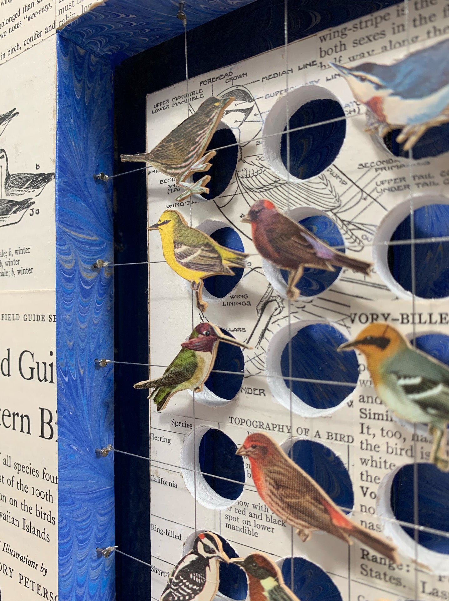 Details: 30"L x 12"H x 1.5"D. Vintage Rodger Tory Peterson field guide bird illustrations, vintage newspaper and marbled paper. Wire and nails. Wood frame.