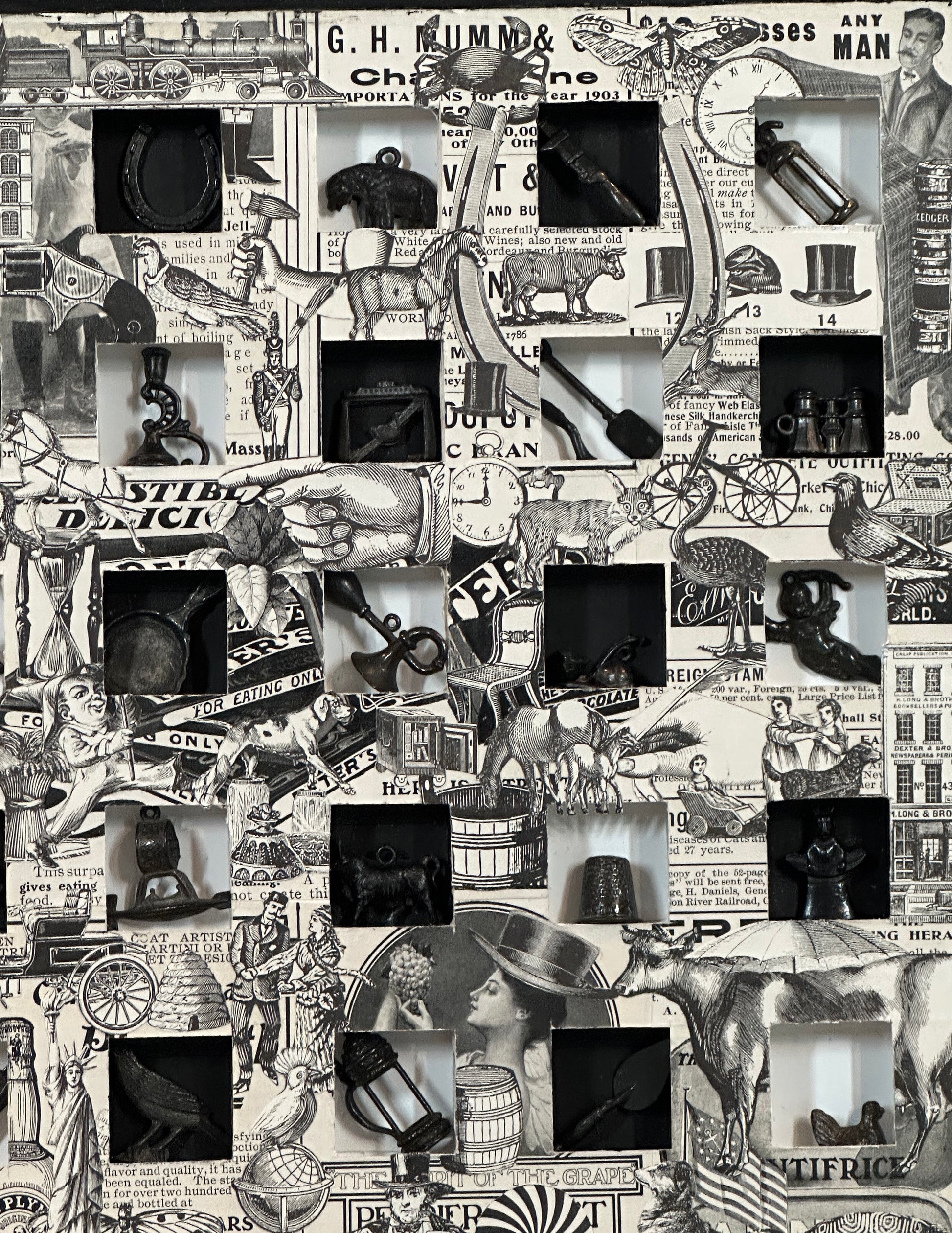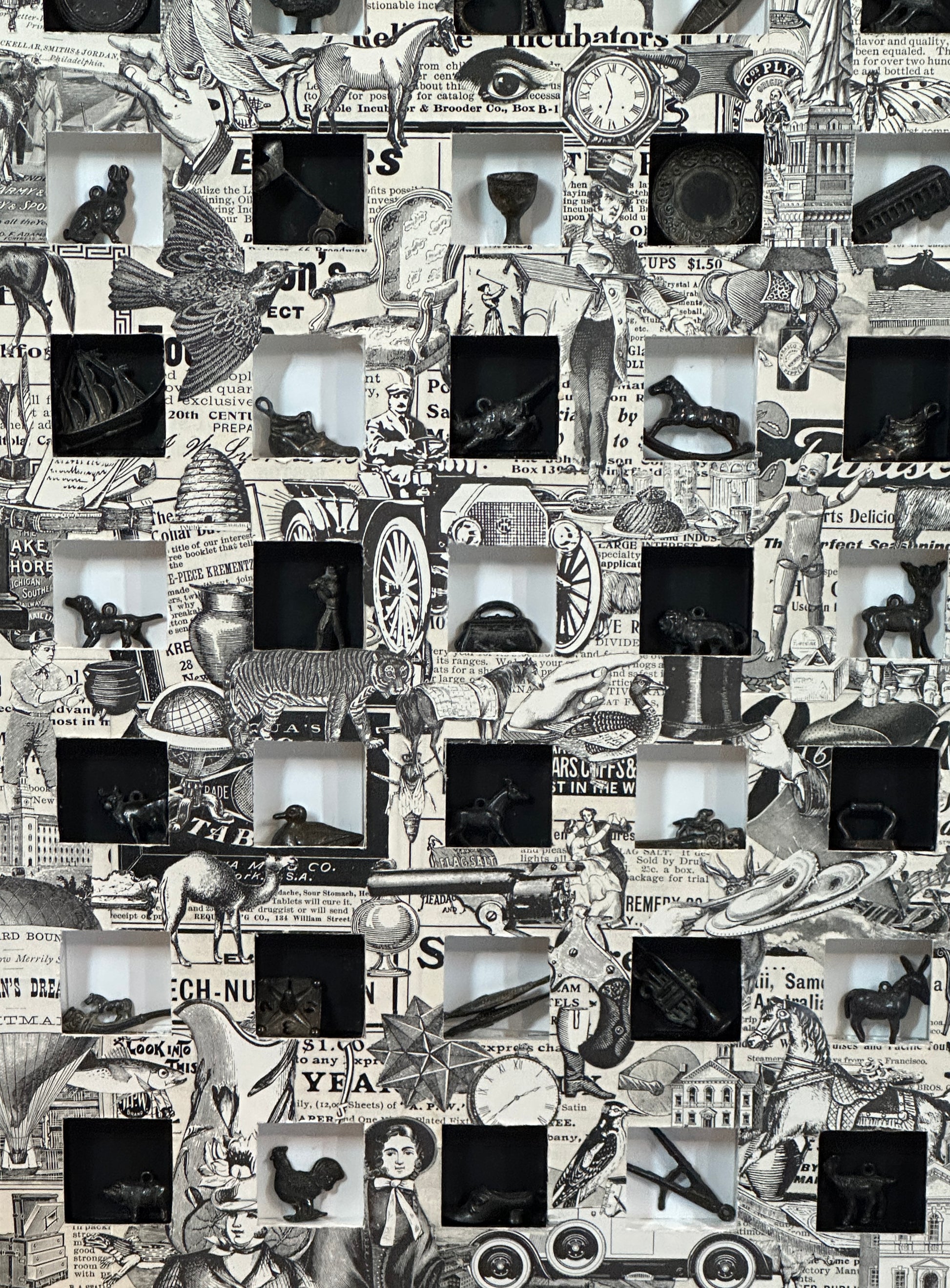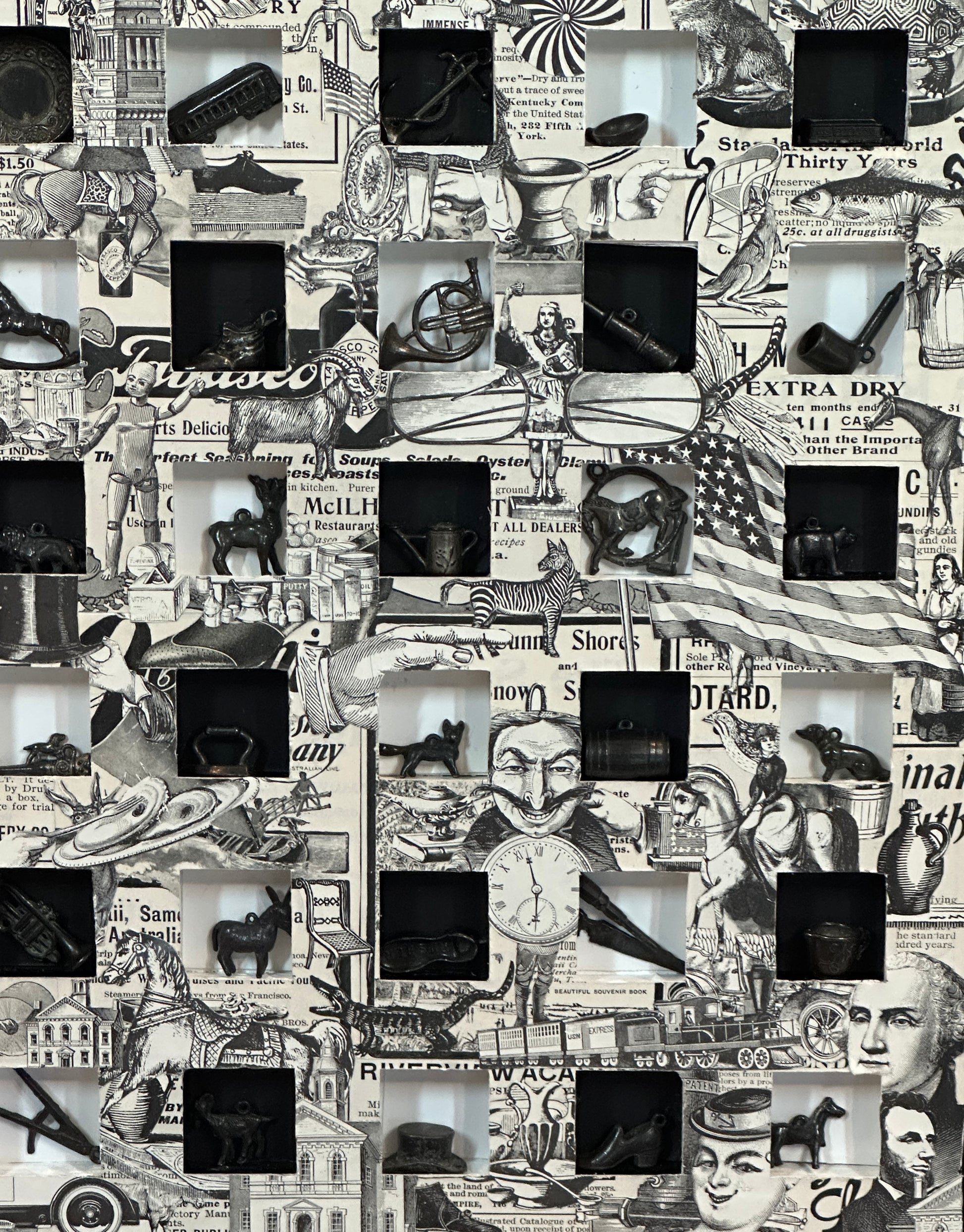 This striking 32" x 24" vintage piece showcases a rare collection of 1920s black metal Cracker Jack charms and authentic catalog illustrations. Encased in a classic wood frame, it brings a unique blend of history and charm to any space. Perfect for collectors or those seeking a nostalgic statement, this artwork captures the spirit of a bygone era with timeless appeal.