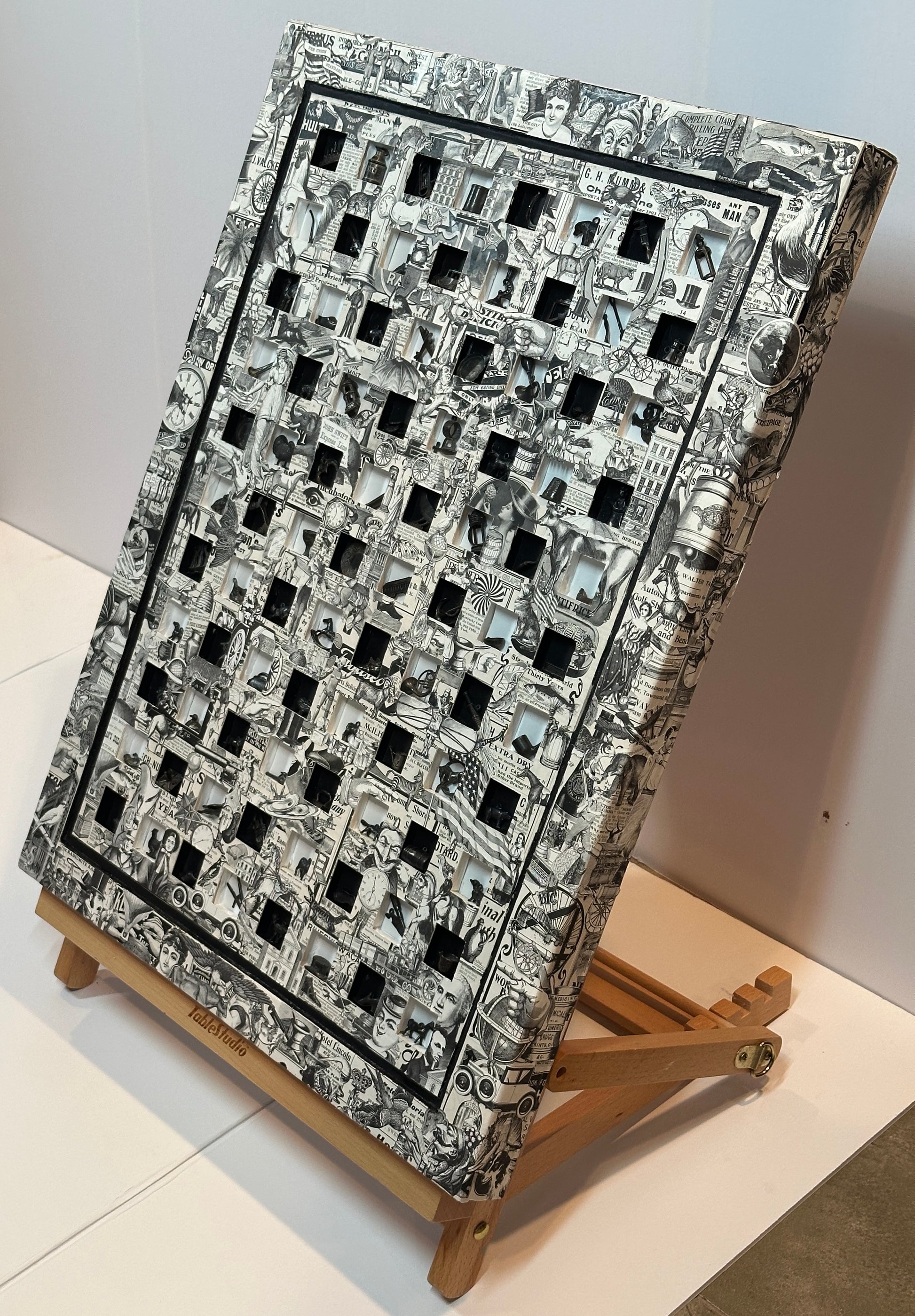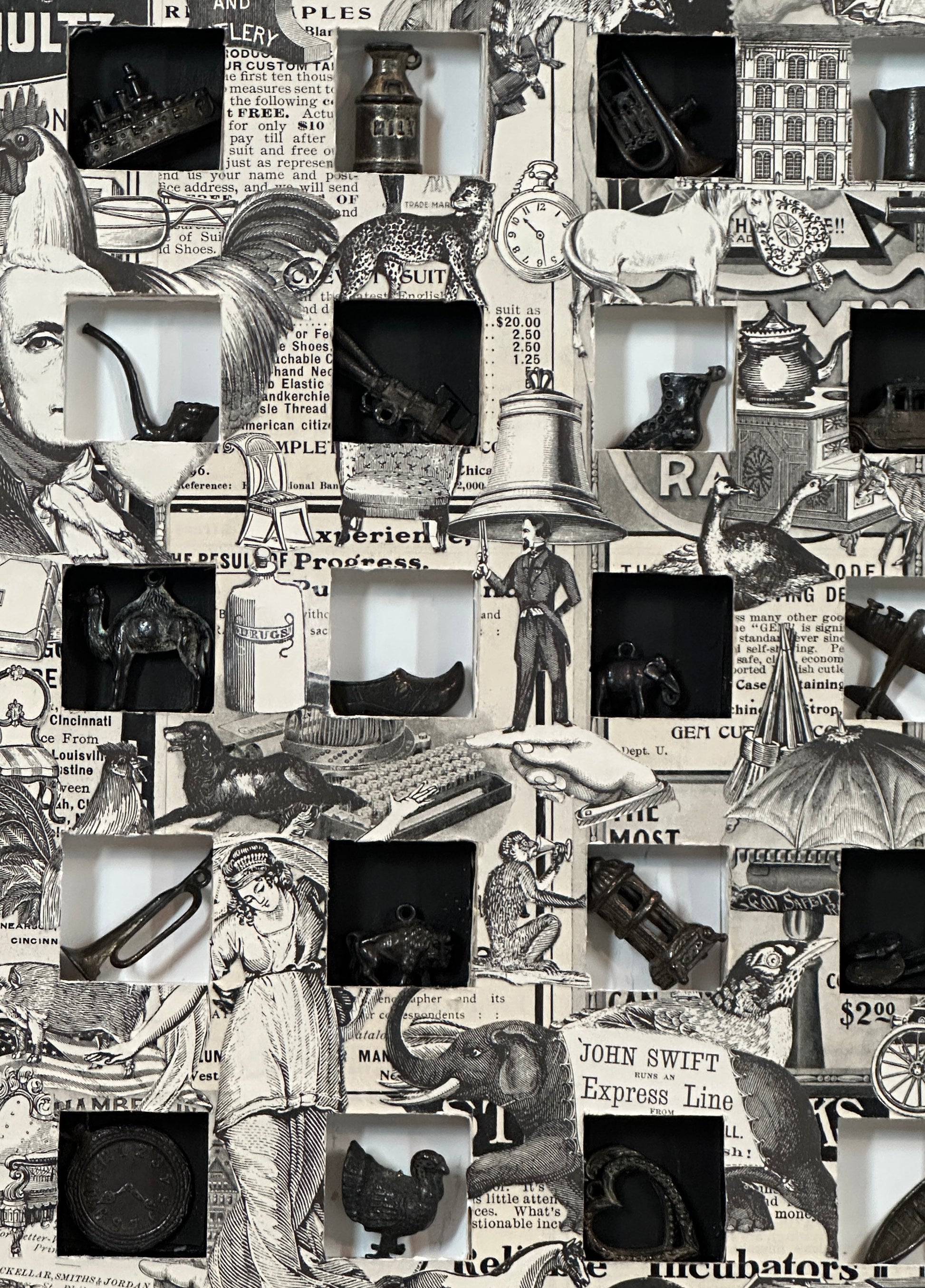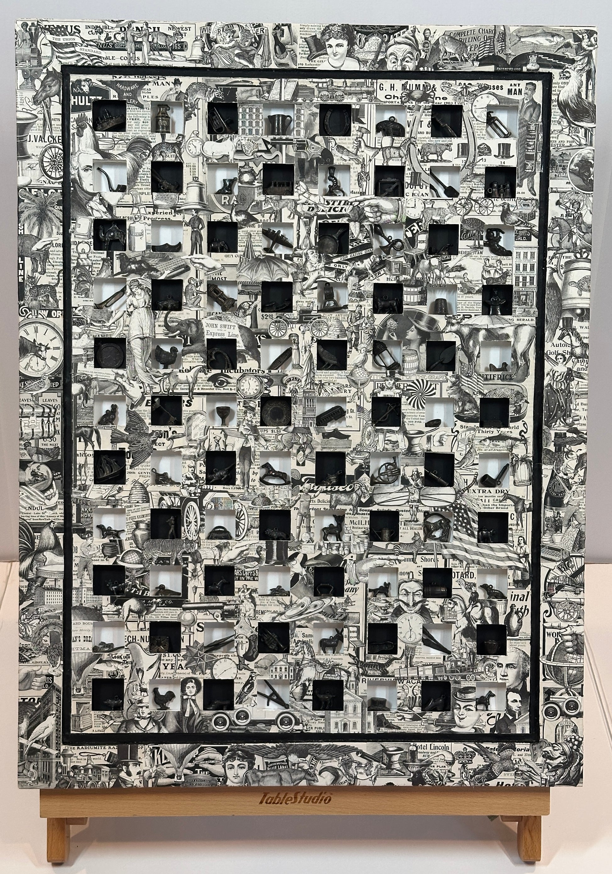 This striking 32" x 24" vintage piece showcases a rare collection of 1920s black metal Cracker Jack charms and authentic catalog illustrations. Encased in a classic wood frame, it brings a unique blend of history and charm to any space. Perfect for collectors or those seeking a nostalgic statement, this artwork captures the spirit of a bygone era with timeless appeal.