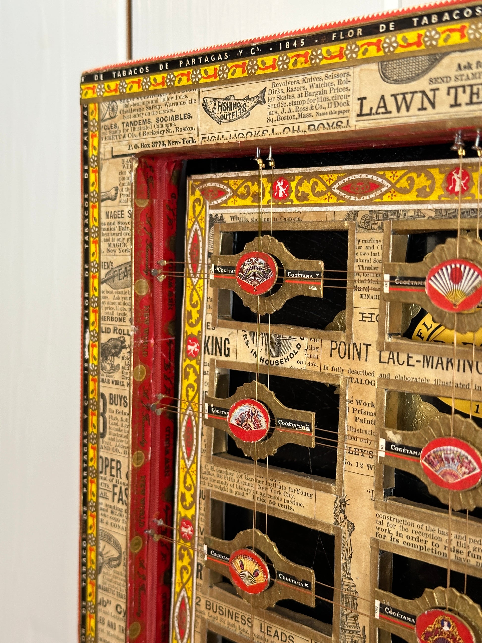 Details: 12"L x 16"H x 1.5"D. Vintage Cogetama hand fans cigar band collection, cigar box top and paper trimmings, vintage newspaper/magazine illustrations. Wire and nails. Wood frame.