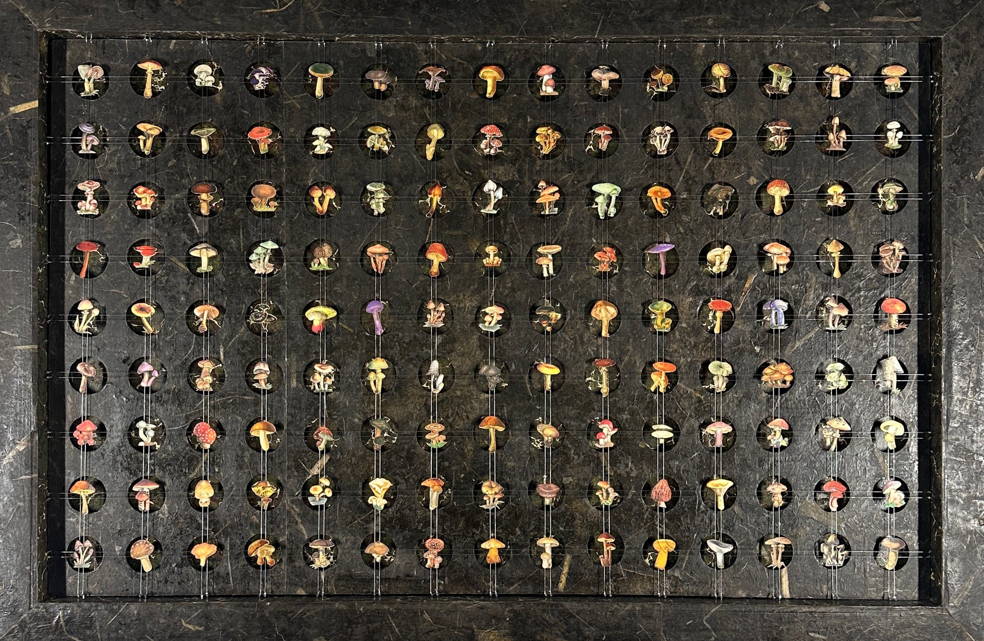 Details: 36"W x 24"H x 1 1/2"D. Vintage mushroom illustrations, marbled paper, wire and nails, wood frame.