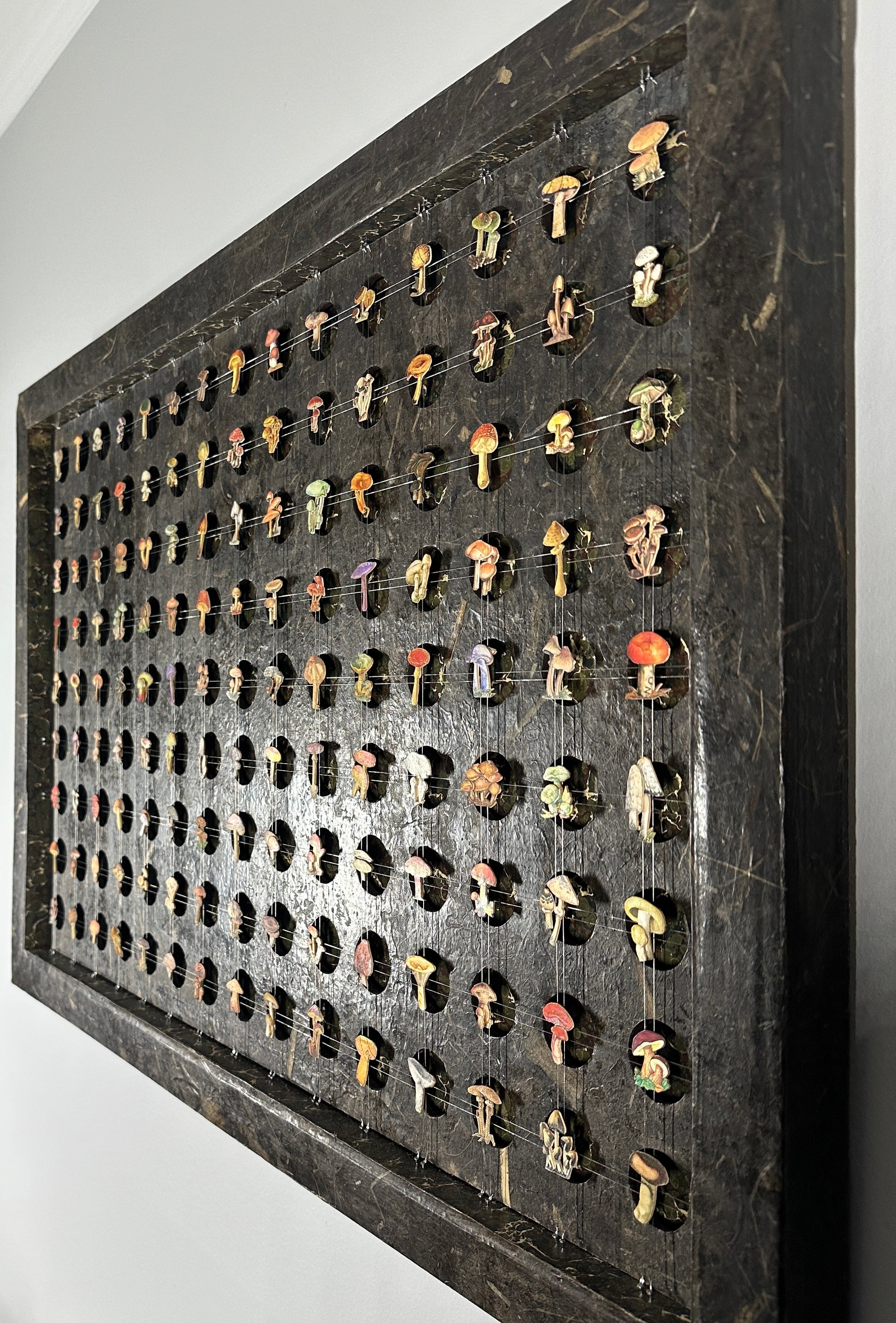 Bring a touch of natural elegance to your space with "MUSHROOM KINGDOM." Measuring 36" wide by 24" high and 1.5" deep, this artwork features vintage mushroom illustrations set against marbled paper, all framed in wood with wire and nails for a rustic, authentic feel. Perfect for adding character and a unique botanical charm to any room.