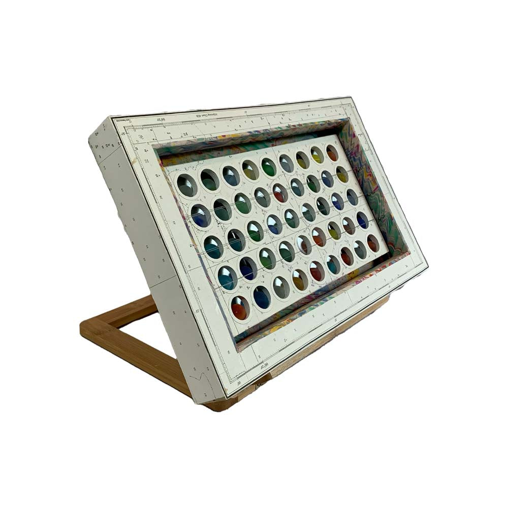 Transform any space into a seaside oasis with our NAUTICAL SES GLASS No. 3! This stunning art piece features vintage sea glass marbles, marbled paper, and nautical illustrations. With a wire and nail construction and a wooden frame and stand, it's both durable and beautiful. Bring the ocean vibes home today!
