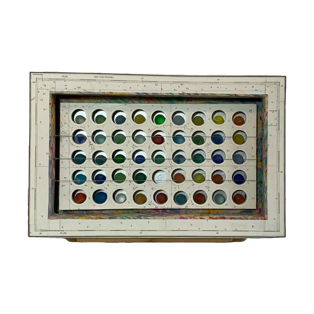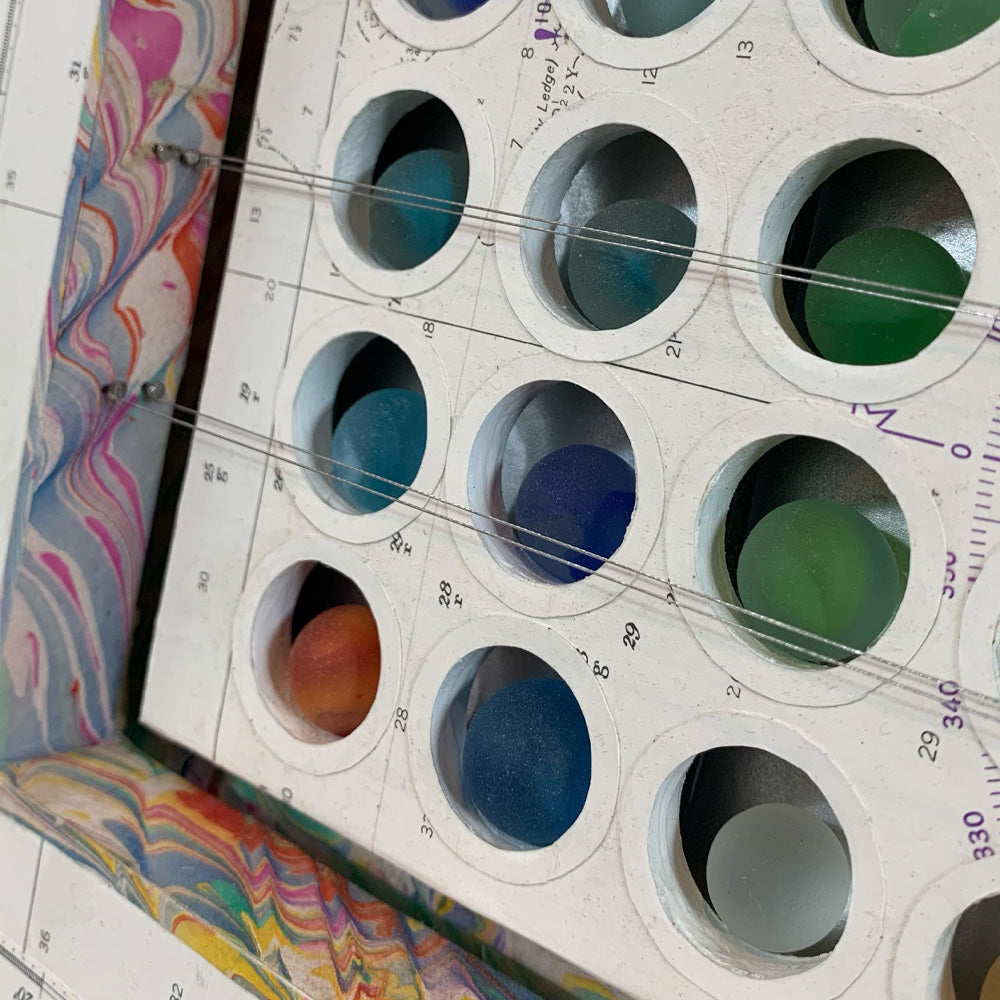 Details: 12" L x 8"H x 1.5"D. Vintage sea glass marbles, marbled paper and nautical illustrations. Wire and nails, wood frame, wood stand.