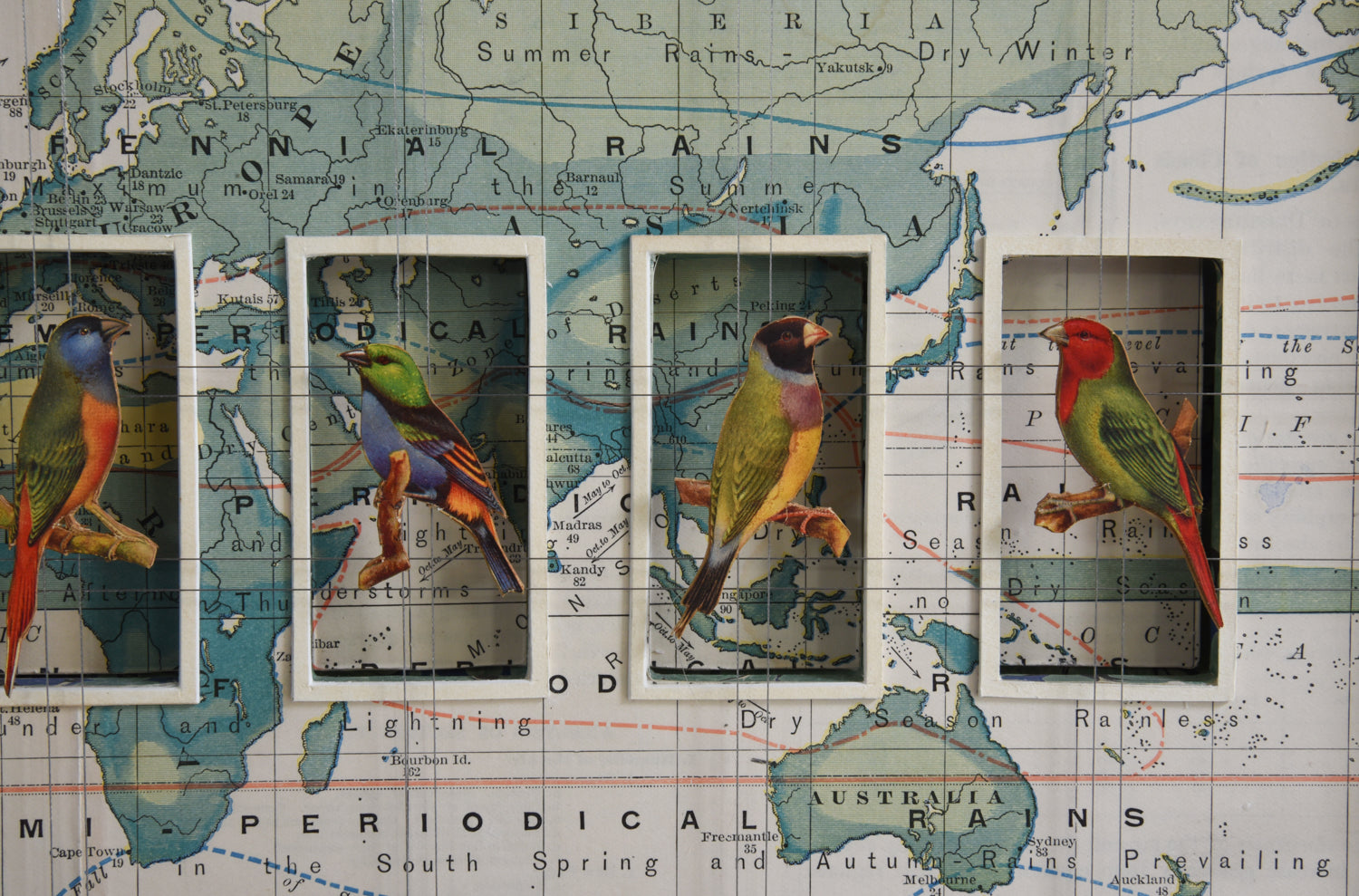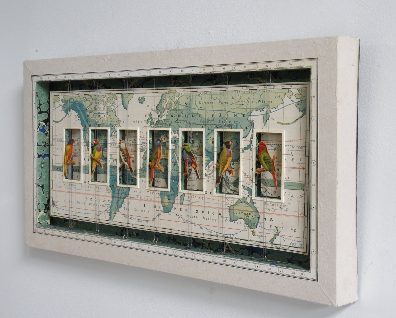 Details: 10"H x 20"L x 1.5"D. Vintage parrot illustrations, world map. Wire and nails. Wood frame.